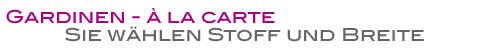 Gardinen nach Maß: (1) Wählen Sie eines unserer vier Gardinen-Designs. (2) Dann stellen Sie die Höhe und Breite der benötigten Gardinenschals ein, wählen zwischen Röllchen und Schlaufen und evt. Zubehör. (3) Sie senden uns per Post Ihren Stoff. (4) Sie erhalten die fix und fertig genähten Gardinen per Post. |